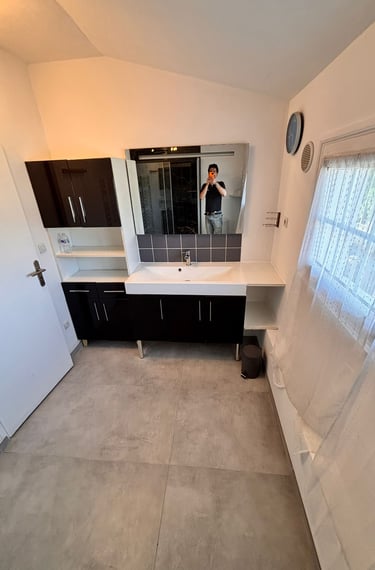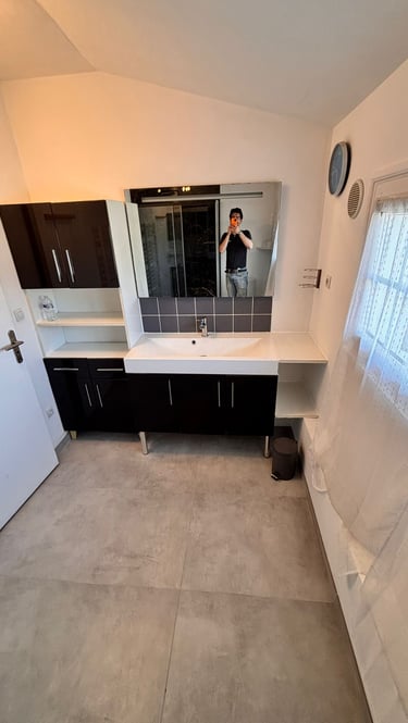Le meuble vasque, aux lignes sobres et fonctionnelles, offre un large plan de toilette et des rangements optimisés. Le miroir mural complète l’aménagement en apportant luminosité et confort d’utilisation au quotidien.