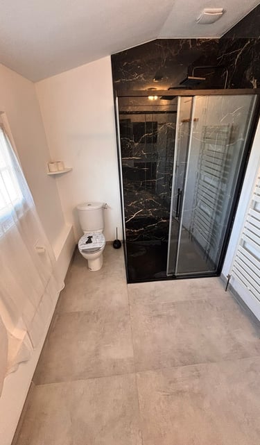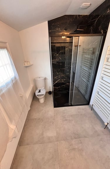 La douche a été entièrement repensée avec une cabine fermée au design contemporain, intégrant des revêtements effet marbre noir, apportant caractère et élégance à l’espace. La robinetterie noire et la douche de tête renforcent l’aspect moderne et haut de gamme de l’ensemble.