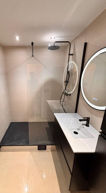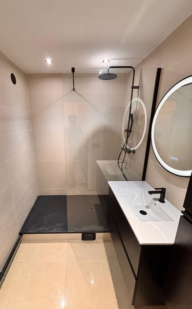 Le choix de carrelages grand format aux tons beige chaleureux crée une atmosphère élégante et intemporelle, tout en facilitant l’entretien. Les finitions ont été réalisées avec soin afin de garantir un rendu esthétique durable et conforme aux normes en vigueur.